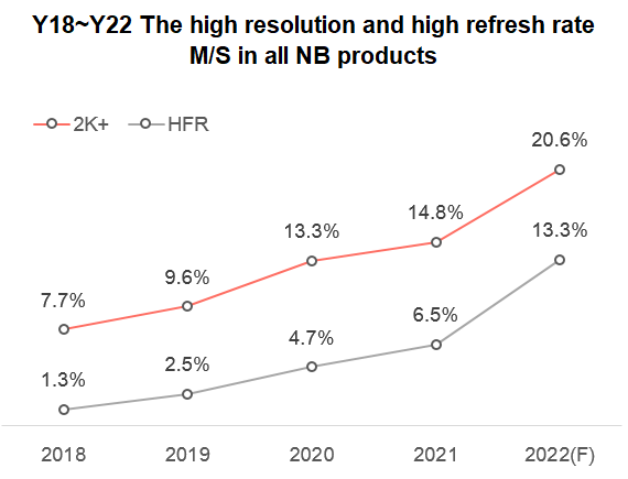 From the supply perspective, the panel manufacturing capacity and the wafer manufacturing capacity have gradually stepped out of shortage. The panel and IC supply chain have more resources and stronger motivation to support product development with high resolution and high refresh rate. According to the forecast data of Sigmaintell, in the global notebook panel shipments in 2022, the penetration rate of high resolution (2K+) will increase from 14.8% in 2021 to 20.6% in 2022; the penetration rate of high refresh rate (120Hz+) will increase from 6.5% in 2021 to 13.3% in 2022.