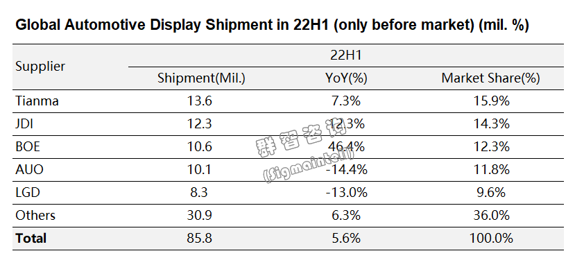 By readjusting the new "2+1+N" strategy, Tianma has positioned the automotive business as one of the company's two core businesses: strengthening the automotive business while continuously increasing investment in the automotive field and strengthening cooperation with OEMs. Tianma is accelerating the layout of the EV track. Although shipments in Q2 were significantly affected by the epidemic lockdown in Shanghai and declined month-on-monthquarter-on-quarter. With the strong market demand and its good customer base, Tianma's automotive display shipments in 22H1 will be about 13.6 mil., an increase of about 7.3% YoY, and continue to rank first in the before-market with a market share of 15.9%.