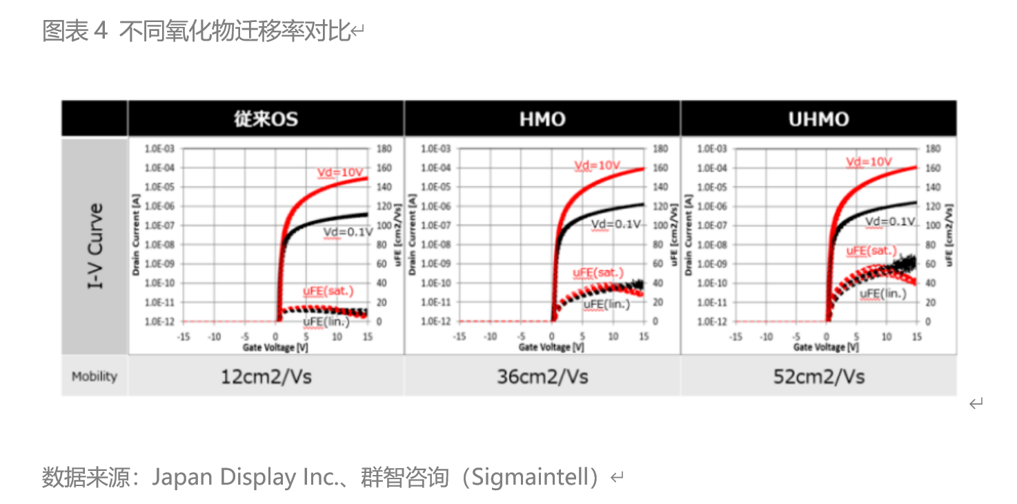 高迁移率氧化物半导体 (HMO,High Mobility Oxide)技术,可生成的场效应迁移率,是传统 技术2 倍以上。超高迁移率氧化物半导体 (UHMO,Ultra High Mobility Oxide)技术的迁移率是传统技术4 倍以上。UHMO在JDI G6量产线上的场效应迁移率为52cm2/Vs,氧化物半导体TFT在量产生产线上实现了非常高速的特性。该技术已经可实现与 LTPS 相接近水平的导通电流,同时保持低截止漏电流。虽然传统的高迁移率 AMOLED 背板需要 LTPS 技术,这将玻璃基板尺寸限制在 G6,但该技术可用于 G8 或更大的生产线。