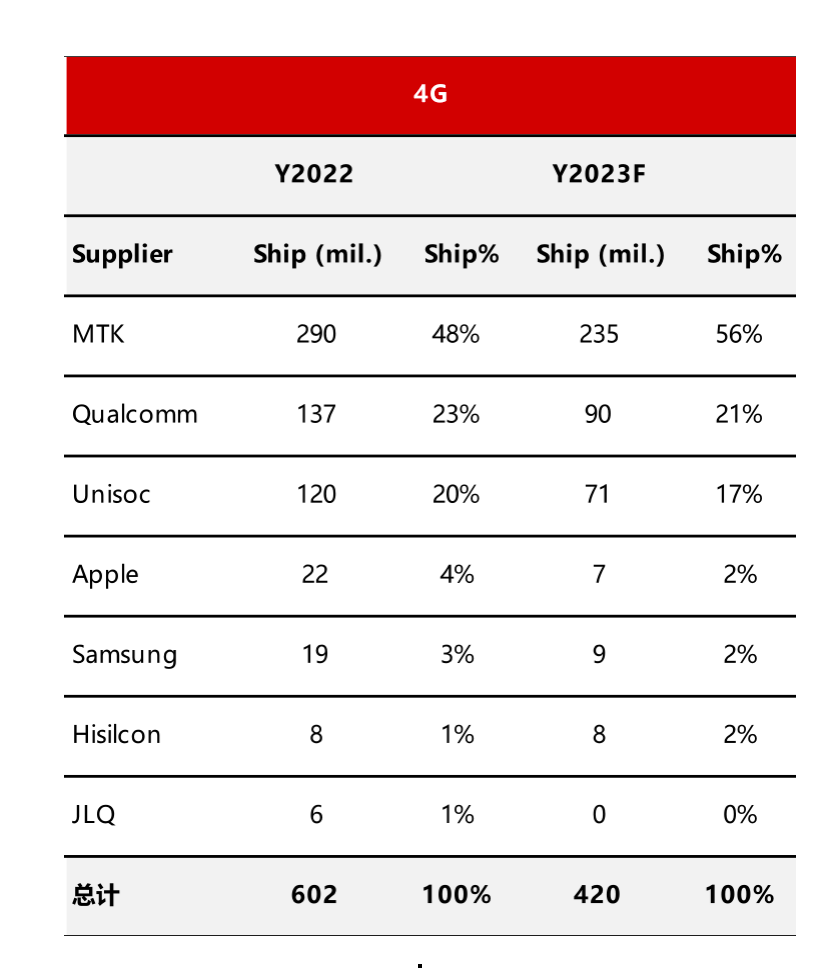 从供应端来看,高通SDM680 全球库存预计在3-5mil左右,库存不高。由于5G的需求较疲软,影响了高通全年的出货目标。根据群智咨询(Sigmaintell)的调查数据,MTK 4G芯片的市场份额2023年将达到56%,而高通仅有21%,另考虑台积电 6-7 nm的产能较富余,高通想提升其4G芯片的市场份额,因此对SDM680进行降价促销,以此来吸引部分MTK的客户,扩大其4G市场份额,提升整体的出货量。 Source:Sigmaintell ......