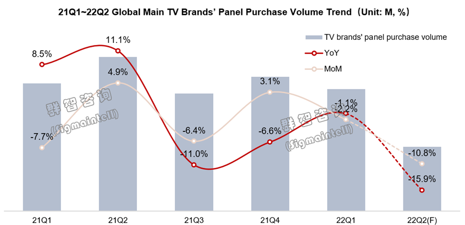 Channel and brand purchasing strategies continued to be conservative. Under the expectation that the end-market demand will be challenging to recover in the short term, channels and brands insist on purchasing on-demand to reduce the risk of set inventory. Affected by the war, global brands swiftly tightened their procurement strategies, including Samsung Electronics starting the revision of panel orders from the end of the first quarter; LG Electronics tightened the inventory risk control and conservative panel procurement in the second quarter. The impact of epidemic control on demand and logistics has lowered the expectations of Chinese brands for the semi-annual promotion and affected Xiaomi, TCL, and other leading brands to maintain the panel procurement strategy of "determining production based on sales and purchasing production" in the second quarter. In North America, the channel has also delayed the purchase target of "Black Friday,” and no significant number of valid orders have been reached so far. According to statistics from Sigmaintell, under the influence of conservative procurement strategies of global brands in the second quarter, the number of global Top 9 brand TV panels purchased was 37 million, a YoY decrease of 15.9% and a QoQ decrease of 10.8%. The panel purchasing requirements are weak.