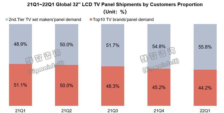 The demand for panels in the second-tier market has cooled down, and the need for small sizes has declined. Since 21Q4, taking advantage of logistics costs and the rapid price correction, the demand for small-sized panel stocking has shown a relatively strong performance, mainly due to the recovery of the second-tier market demand, supplemented by the increase in brand demand. Second-tier manufacturers have started strategically stocking small-size panels, coupled with panel makers' active stocking; small-size panel shipments have remained high. According to research data from Sigmaintell, as of 22Q1, second-tier brands accounted for more than 55% of the 32" panel shipment, becoming the primary source of small-size panel purchases. However, the deterioration of the end market environment has made the recovery of the demand for small-size panels insufficient. The need for small-sized panels has dropped significantly after the pull of the second-tier market weakened.