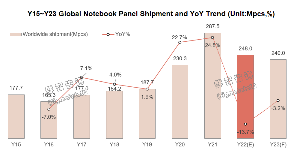 According to research data from Sigmaintell, the global shipment of notebook PC panel in 22Q1 was 70.3 million pieces, which decreased 9.3% from the peak in 21Q4; As the epidemic waned, the demand for overseas educational tenders has declined. In 2022, the demand for notebook PC enters a stage of rational development, and the scale of shipments drops in stages. However, the macro environment and geopolitical factors have exacerbated the degree of change, which is expected to bring short-term effects to the global supply chain of notebook computers supply. The mian notebook brands have accelerated their depurchasing strategies starting from the second quarter. Sigmaintell estimates that the global shipments of notebook panels in 22Q2 will be 57.9 million pieces, with a MoM decline of 17.7%.The total shipments are expected to be 248 million pieces in Y22, with a YoY decline of 13.7%.