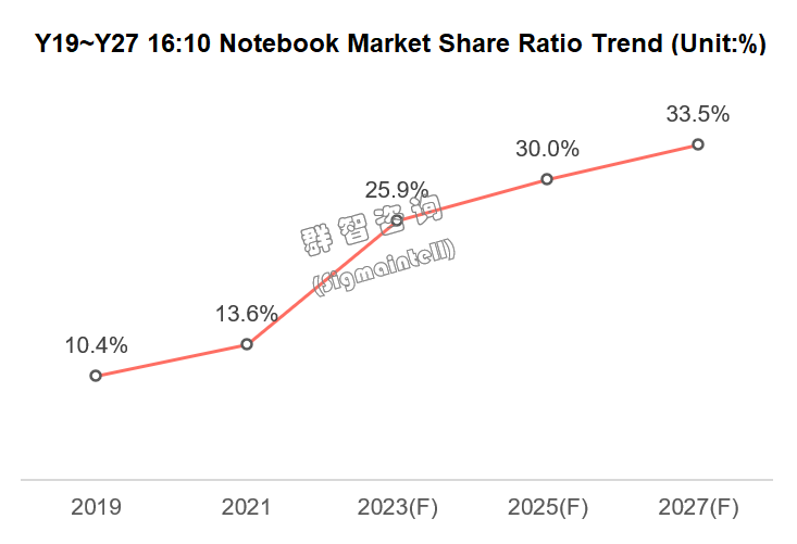 Sigmaintell believes that the penetration rate of 16:10 in the notebook market will gradually increase and become an important segment of the global notebook market. It is estimated that by 2027, the penetration rate of the 16:10 notebook market will reach 33.5%.