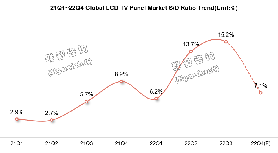 According to Sigmaintell's “supply and demand” model, in Q4, driven by the low level of brand purchasing demand, the positive effect brought about by the large production cut of panel makers gradually played a role. The global LCD TV panel market in Q4 of 2022 The S/D ratio will gradually fall back to 7.1% (area benchmark), and the overall S/D environment is still loose, but small and medium-sized products without inventory pressure will gradually tend to be tight in supply.