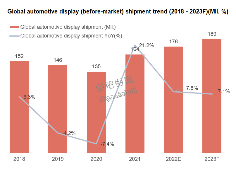 预计2022年全球前装车载显示面板出货量约为1.76亿片,同比增长约7.8%,单车搭载率约2.2片