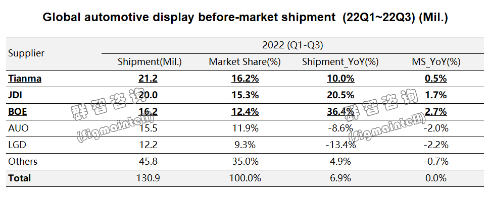 Along with the sluggish demand for other applications, panel makers are also paying more attention to the automotive display business, and new panel makers are constantly joining in. At the same time, the upstream and downstream supply chains penetrate each other, and the competition is becoming fiercer. Major panel makers have deepened communication with OEMs and consolidated cooperation with their customers by increasing investment in automotive display-related fields. According to Sigmaintell’s statistics, global shipments of automotive display for before market in the first three quarters of 2022 were about 130 Mil. (Only before-market), a YoY increase of about 6.9%. From the perspective of the competitive landscape of panel makers, the specific performance is as follows: