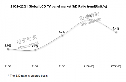 In terms of the overall supply and demand, according to Sigmaintell's “supply-demand model” calculation, the supply-demand ratio in 22Q1 will be 6.4%, maintain a loose supply. Supply and demand will gradually tend to become balanced in 22Q2. Affected by this supply-demand anticipation, LCD TV panel prices in 22Q1 are predicted to maintain a downward trend and the decline will be significantly narrowed. In 22Q2, prices are expected to stop falling and become stable.