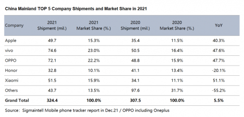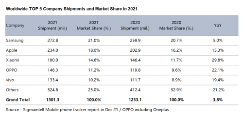 Looking back on 2021, the overall brand strategy is slightly aggressive. Apple, Xiaomi, OPPO, and vivo all benefited more or less from Huawei's withdrawal. Shipments all increased YoY to varying degrees, but they also created a "high inventory of components" scenario. Looking forward to 2022, Samsung and Apple will still rank first in the industry with their stable and robust supply chains. Domestic set makers will enter a period of strategic adjustment, with healthy and stable operation as their primary appeal.