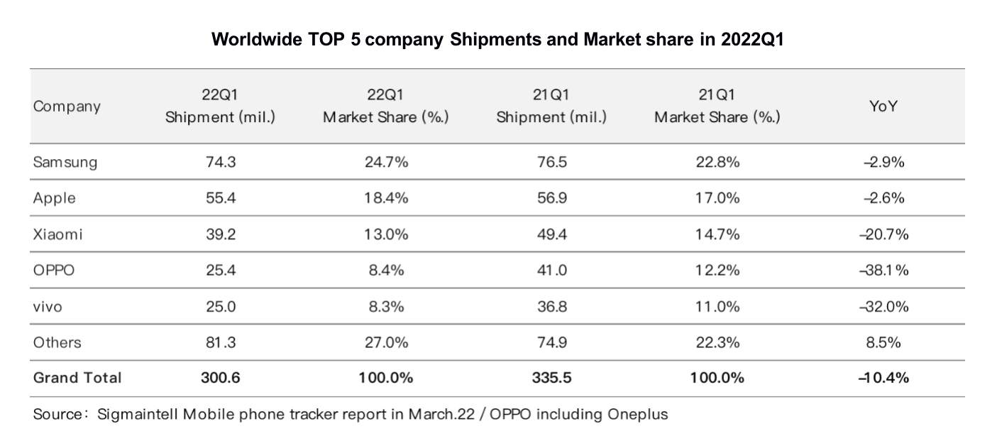 Affected by the conflict between Russia and Ukraine and the domestic epidemic control, the overall performance of smartphone sales in 22Q1 was weak, and consumers lacked motivation to change smartphone. According to Sigmaintell data, the global smartphone shipments in 22Q1 will be around 300.6 million, YoY declined around 10.4%.