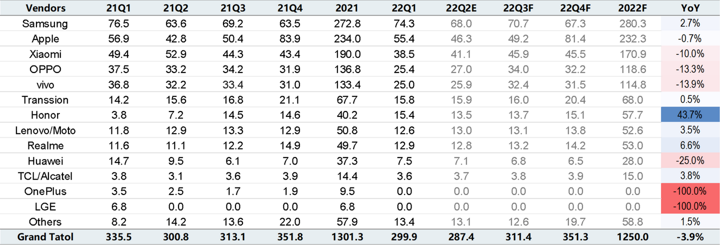 Based on worse environment and set makers feedback, we have to adjust down whole year forecast data from 1285mil. in March. to 1250mil. in May., Within that, SEC and Apple also have to decline their BP in 2022 due to worse economic in overseas market, especially in Euro and North America. Frankly speaking, it was underestimated about Shanghai lock-down period in China mainland. China central government started to rectify unbecoming policy from the end of May. So it will impact the demand of 22Q2 and 22Q3 market recovery. The demand of China mainland forecast data had been reduction from 285mil. to 280mil. in 2022. oppo and vivo target will be possible to be down due to honor aggressive feedback.