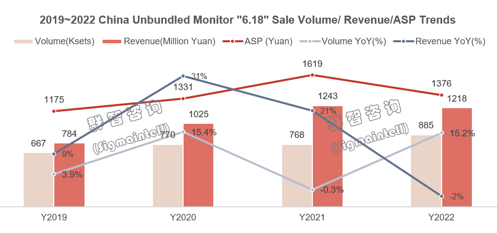 Sigmaintell’s data shows that during the "6.18" in 2022, China's online unbundled monitor market was characterized by "volume increase but value decrease": total sales of about 885,000 units (JD + Tmall), a positive YOY growth of 15%. The total sales was about 1.22 billion CNY, down 2% YOY.