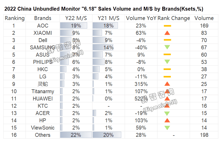 According to Sigmaintell's data, China unbundled curved monitor market was still in a cold winter in 2022, and the brand's curved strategy is not active, with total sales of 103,000 units, down 22% YOY.