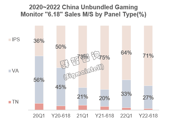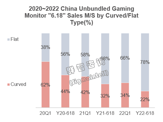 As shown in the figure below, from 20Q1 to 2022 "6.18", VA curved unbundled gaming monitor market share has shrunk significantly, IPS flat gaming has been the absolute majority.