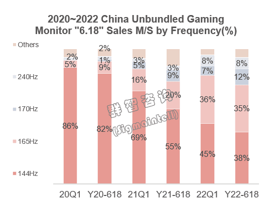 As shown in the figure below, the refresh rate structure of this year's "6.18" unbundled gaming monitor market has shown a steady upgrade trend, and the majority of 165Hz has also been highlighted. 165Hz (including 170Hz overclocking) has a market share of about 47%, replacing 144Hz and holding "half of the unbundled gaming monitor market". Although 144Hz is the starting point of gaming high refresh rate tech, but to a certain extent, the product layout of the main gaming panel makers and set makers around high refresh rate, wide screen and fast response time at 165Hz is the key driving force for the strong development momentum of high refresh rate tech. In this process, the mainstream specifications of unbundled gaming monitors have also completed the evolution from FHD+144Hz to QHD+165Hz.
