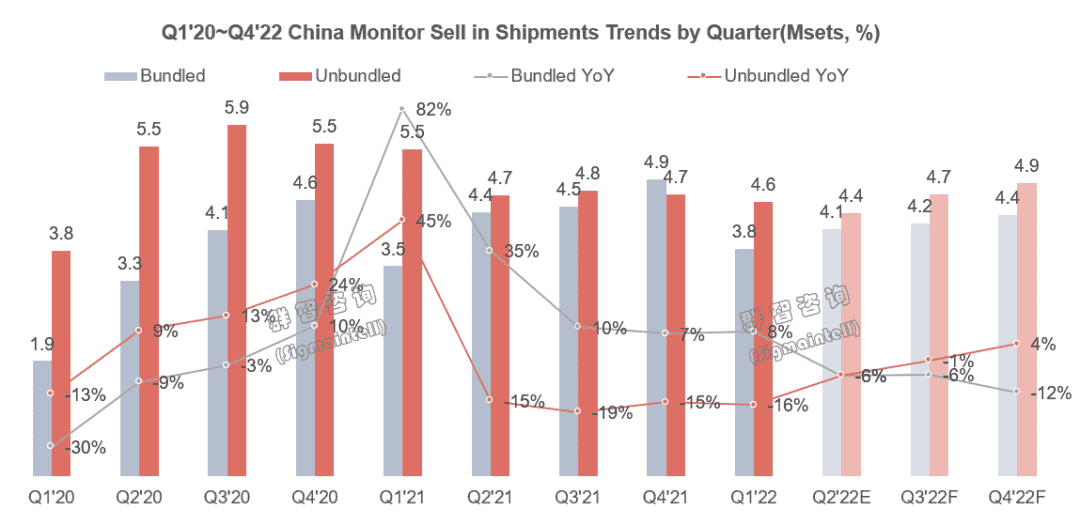 The performance of the "6.18" market did help to de-stocking the backlog in 22H1 of the channel, but there is also the risk of overdrawing the online market demand. Looking ahead to 22Q3, the online market will contract cyclically, while the offline DIY market is still difficult to rejuvenate. However, the market also has the opportunity to recover the demand for Internet cafes and line orders. Overall, the market size of China's unbundled monitor market in 22Q3 was 4.7 million units, down 1% YOY and up 3% MOM. From a full-year dimension, the Chinese unbundled monitor market will also show a YOY decline, with an expected decline of about 5%.