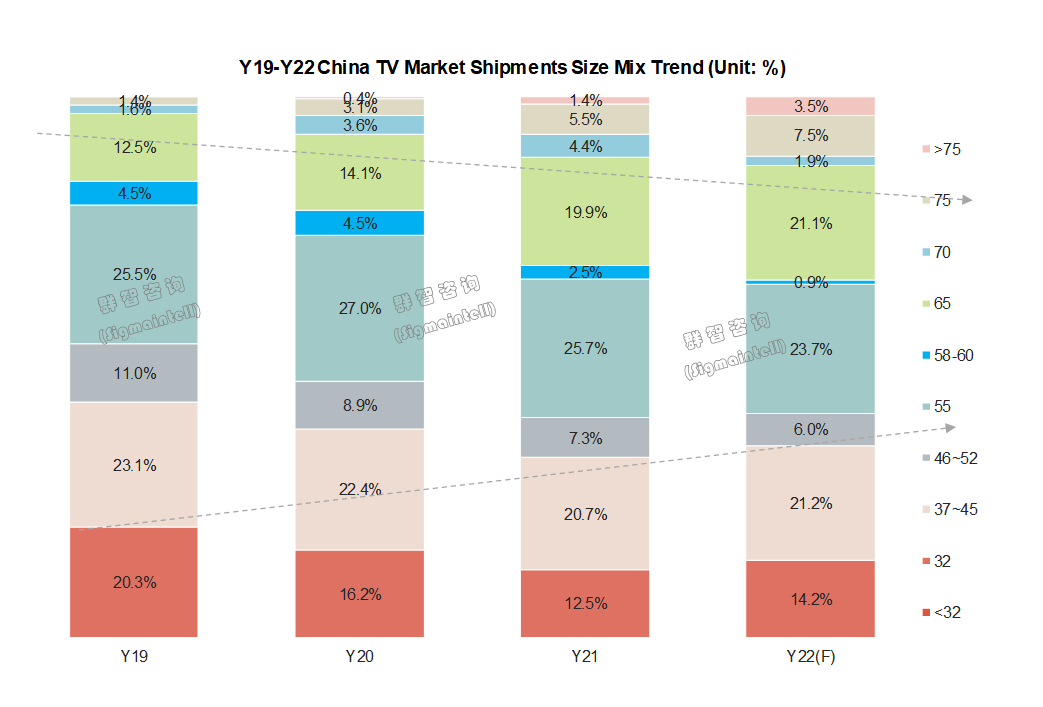 Consumption downgrade: The continuous spread of the epidemic in many provinces and cities has affected the real economy, service industry, tourism, etc. The pressure of consumption downgrade comes from the high unemployment rate, declining consumer demand, rising household savings, and turning to a conservative consumption attitude. It can also be seen from the TV product structure in the Chinese market that, according to Sigmaintell’s data, the demand for 32”/43” small size has recovered. At the same time, the demand for extra-large sizes of 75” and above has increased significantly due to the positive layout of the brand, the demand orientation of profit margins, and the impact of the demand of the consumer market. However, the large-size process in the Chinese market that has been going on for many years has slowed down. As panel costs continue to drop, the trend of large-scale size will recover in 2023.