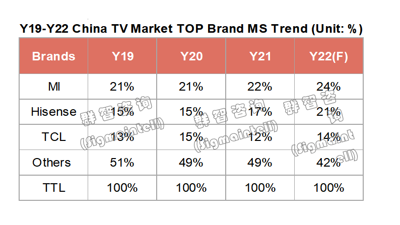 As the brand with the largest market share in China's TV market, Xiaomi (MI) is also an early practitioner of the dual-brand strategy. REDMI is positioned at the mid-to-low end to support the brand’s growth. In 2022, on the one hand, the Chinese market strategy will turn to product profitability, weakening the concept of the Redmi brand. On the other hand, the flexible supply chain strategy will give it a low-cost advantage. The Redmi brand was able to support Xiaomi's continued aggressive pricing strategy for EA entry-level products. The proportion of Xiaomi compared to Redmi will recover in 2022. At the same time, improving offline store efficiency will support the relatively stable market size of Xiaomi in China. According to Sigmaintell’s data, Xiaomi is expected to ship 9 million units in the Chinese market in 2022, maintaining steady growth.