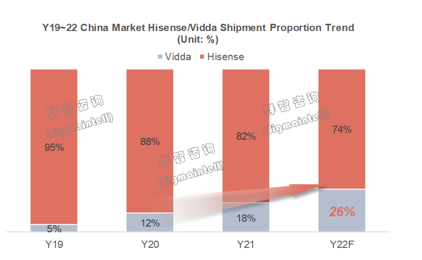 Hisense (Hisense) has been aggressive in the Chinese market strategy after a short period of overseas market epidemic premium recession. In 2021, the product positioning of the Vidda brand was focused on audio-visual entertainment and products with precise layouts, such as games and music for young people. With the making, design, and channel capabilities and the active release of mid-to-low-end channel resources, the Vidda brand has achieved rapid growth from small and medium sizes. According to Sigmaintell’s data, Hisense is expected to ship 8 million units in the Chinese market in 2022, a YoY increase of over 17%. Among them, Vidda's shipments in the Chinese market will exceed 2 million units, achieving rapid growth and becoming an important cornerstone to support the development of Hisense's Chinese market.