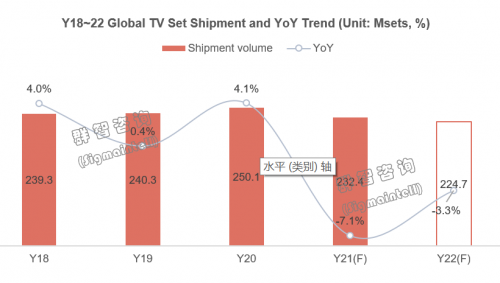 进入后疫情时代,受“宅经济”推动力不断减弱的影响,全球电视市场需求由高增长转向回落。根据群智咨询(Sigmaintell)统计数据显示,2021年全球TV市场出货数量预计达2.32亿台,同比下降7.1%,预计2022年全球TV出货数量为2.25亿台,同比下降3.3%,出货规模呈现持续回落态势。在市场处于下行周期中,如何通过基于场景需求的技术提升,满足消费者趋于理性的消费观念转变,突破增长瓶颈,值得产业链上下游厂商深思。技术变革正处在发展的十字路口,OLED、MiniLED、高刷新以及超大尺寸产品,都将在各自的赛道和产品区间展开激烈的竞争和角逐。