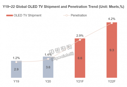According to Sigmaintell, global shipments of OLED TVs are expected to reach 6.6 million units in 2021, a year-on-year increase of 85%, and the market share will reach 3%. In 2022, the global OLED TV shipments are expected to reach 9.35 million units, an increase of 41% year-on-year, and a market share will be more than 4%. The global OLED TV shipment is expected to have an accelerating growth.