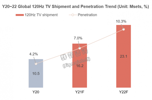 According to Sigmaintell, the global shipment of 120Hz TV is expected to reach 16 million units in 2021, a YoY increase of 54%, and the market share will reach 7%. In 2022, the shipment will exceed 23 million units, a YoY increase of 43%, with a market share of over 10%.