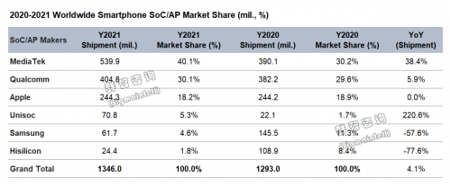 Qualcomm: The Qualcomm Snapdragon 800 series has always been the best choice for most flagship smartphones. Although Qualcomm has strategically reduced the supply of entry-level 4G SoCs in 2021, it has benefited from the development of 5G and the release of iPhone 5G smartphones. As the volume of goods increased, Qualcomm, as the only supplier of iPhone 5G modem, also showed a continuous growth trend in QCT revenue. According to Sigmaintell data, in 2021, Qualcomm's smartphone SoC shipments were about 400 million (excluding 5G Modem), a YoY increase of about 5.9%, ranking second in the world with a 30.1% share. In 2022, as the supply of 4G chipsets shrinks, the overall shipments of Qualcomm SoCs may decline slightly. However, with the launch of its Snapdragon 8 Gen1 and the mass production of the 4nm Snapdragon 700 series, Qualcomm's 5G SoC and modem shipments will continue to grow.