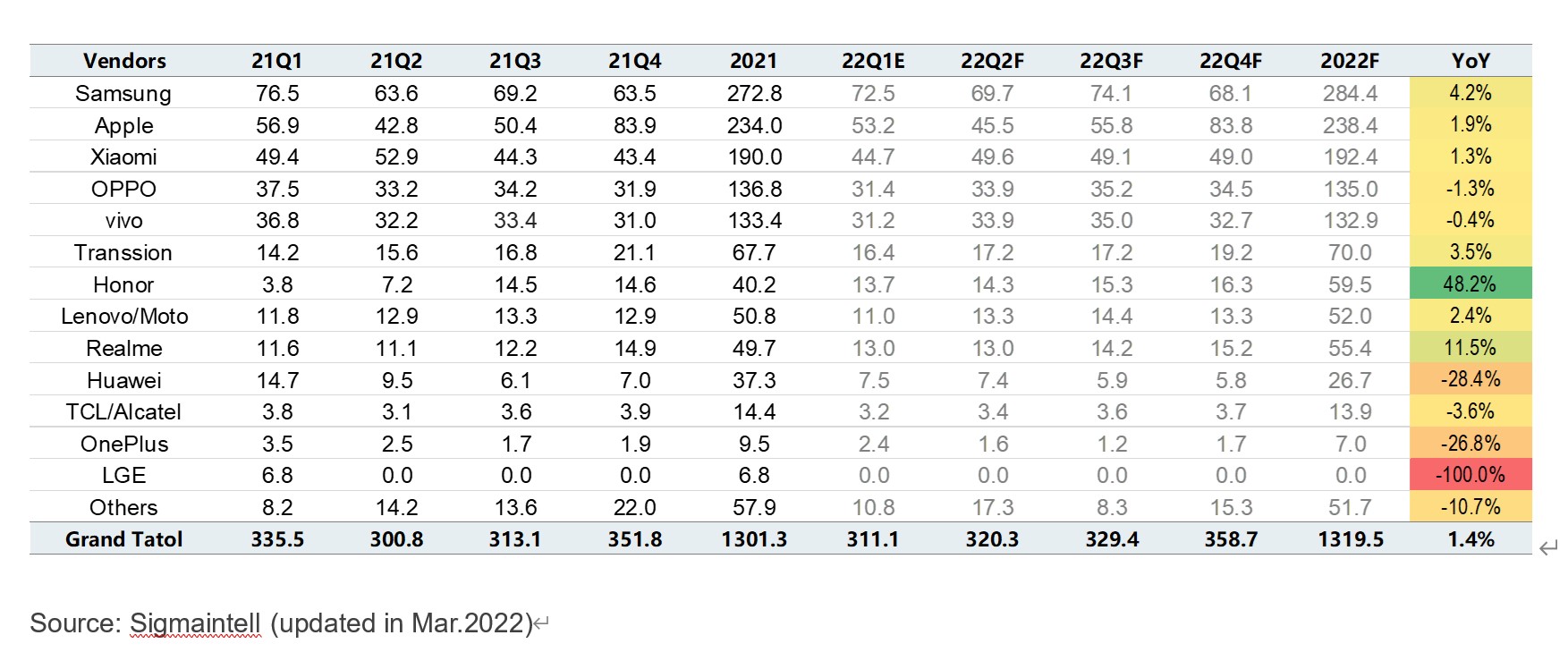 Considering COVID-19 controlling in domestic and Russia & Ukraine conflict, the demand of grand market will be possible down from 1335mil. to 1320mil. The domestic forecast of 2022 had been adjusted from 319mil. in Jan. to 310mil. in Feb.