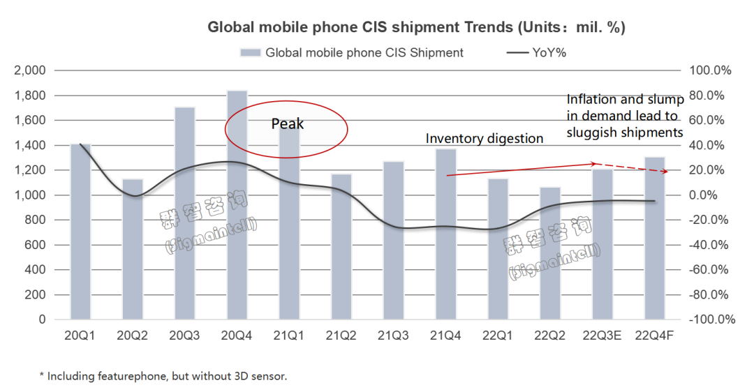 Since the downstream set markers were affected by the shortage of upstream supply in 2020, they began to aggressively increase their stocking plans and excessively release demand plans. However, with the repeated epidemics and international conflicts affecting consumer demand, the rapid recovery has not met expectations, which has directly led to a continuous increase in the inventory level of the entire supply chain. In 2022, the downstream set will focus on digesting inventory and suspending purchases, so that the shipment of mobile phone CIS will continue to decline. According to Sigmaintell’s data, the global mobile phone CIS shipments in 2022 will be approximately 4.71 billion units, a Y-o-Y decrease of approximately 12.2%. The inventory of mobile phone CIS that has been squeezed since the second quarter of last year will take some time to digest. According to the current research and analysis, under optimistic circumstances, the destocking cycle will return to normal levels in 23Q1. When the downstream stocking plan returns to rationality and the upstream production capacity is sufficient, after the global economic environment improves, smartphone CIS will have the opportunity to show slight growth in 2023-2025.