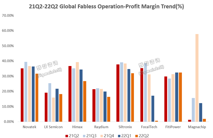 在市场降温的大环境下,Fabless厂商开始经历困难时期。群智咨询(Sigmaintell)统计数据显示,2022年上半年,Fabless厂商营业利润率普遍下滑。各家厂商的应对策略仍以推动技术升级和应用拓展为主,例如:加速TDDI向车载等应用方向渗透。
