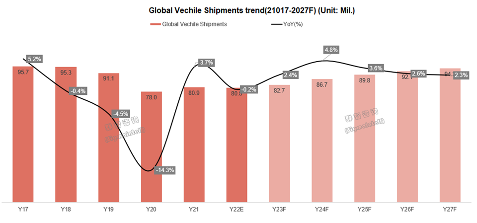 Affected by various factors that are not conducive to economic growth, 2022 is coming to an end. According to Sigmaintell’s statistics, global vehicle shipments in 2022 are expected to be about 80.8 million, a YoY decrease of about 0.2%. However, the growth in 22H2 was obvious, with a YoY growth rate of 10.7%. It can be seen that although the decline in consumption levels caused by the economic downturn has not fully recovered, the reduction in automobile production caused by the lack of chips in the past period is gradually easing. It is expected that in 2023 global vehicle shipments will reach 82.7 million units, an increase of about 2.4% YoY.