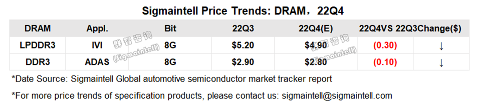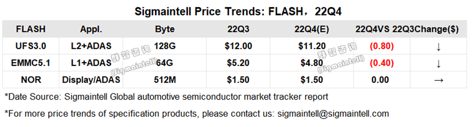 DRAM: Since the price continued to rise in 21Q1~21Q3, it has been falling since November. Sigmaintell forecasts that the price of automotive DRAM will drop by about 10% in 2022. Nowadays, the relative shortage of automotive chips in the automotive industry is MCU and analog IC products, and it has been partially alleviated from 22Q4. It is expected that the price of automotive DRAM will continue to decline until 23Q2. Storage has reduced investment and slowed down the pace of production expansion. It is expected that prices will level off after 23H2.
