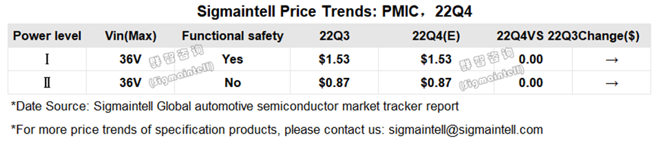 According to Sigmaintell’s survey data, from the perspective of market reaction, due to the serious shortage of materials for automotive PMICs from the beginning of 2021 to mid-2022, the actual purchase price even increased to 30% due to a large number of spot purchases downstream. From the perspective of the fab, the overall increase of automotive PMICs will be about 5-10% in 2021. After entering 2022, the price will remain firm and continue to rise, and it will be difficult to reduce the price in the short term. With the recent launch of TI's new plant, the PMIC production capacity has been eased to a certain extent. Recently, the PMIC products of domestic makers such as SgMicro and 3PEAK have passed the automotive-grade qualification, forcing leading makers to stop price increases and consider taking price cuts to maintain market share. From 22Q4, the price of automotive PMICs will begin to maintain a steady state, and it will most likely start to decline after 23Q2, and the annual decline is expected to be about 10%.