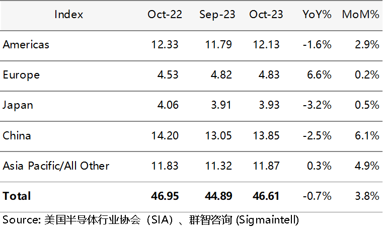 根据SIA最新统计数据,10月全球半导体产业销售额约为466.1亿美金,同比减少1.6%,环比增加2.9%。总体呈现缓慢恢复趋势。同时,这是超过1年来,首次各区域半导体销售额均呈现环比上升。