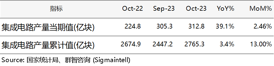 根据国家统计局数据显示,2023年10月中国集成电路生产量约为312.8亿块,同比增幅约39.1%。累计产量约为2765.3亿块,同比增幅约3.4%,该月中国集成电路生产量同比、环比均呈现增长。