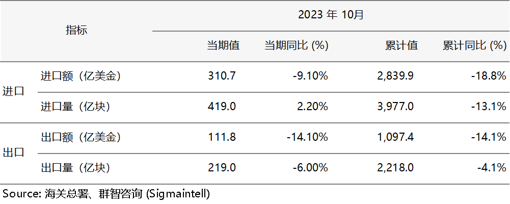 根据中国海关总署数据,2023年10月,中国大陆半导体进口额约为310.7亿美金,同比减少约9.1%,出口额约111.8亿美金,同比减少约14.1%。