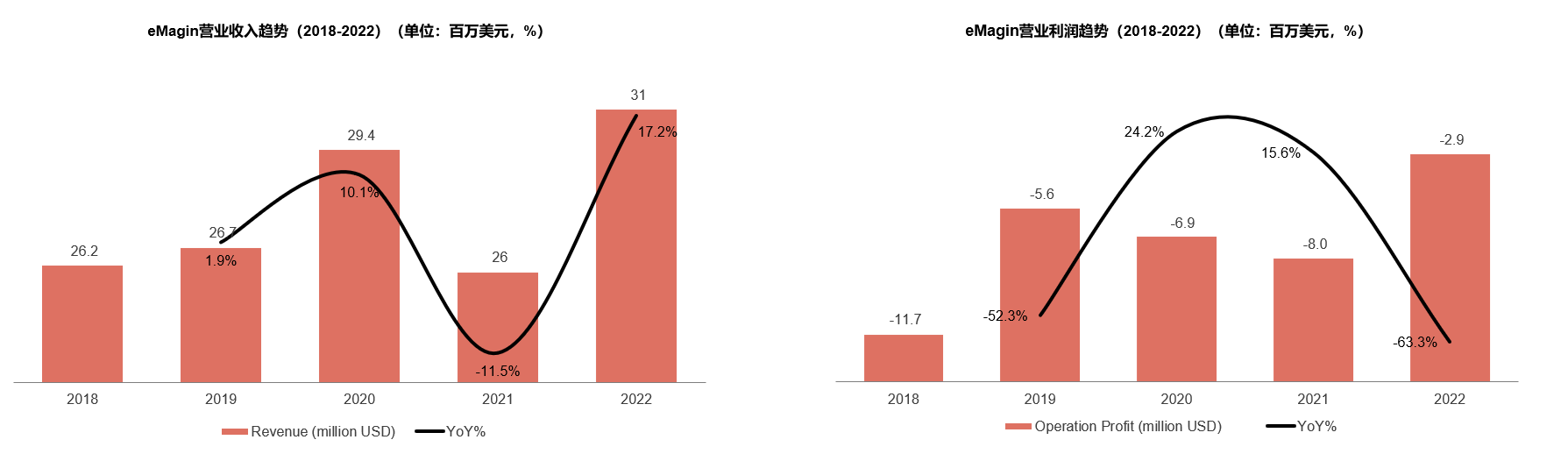 l 对于eMagin而言,虽拥有领先的技术实力,但量产线规模较小。根据财报数据,2022年eMagin营业收入约3100万美金,营业利润亏损约290万美金。近年来营收虽呈现增长态势,但盈利压力较大,主要客户均来自非消费领域订单,客户规模和行业影响力有限。SDC拥有雄厚的产业基础与资金实力,此次并购是双方资源的整合,可以发挥协同效应,降低研发成本,实现技术创新,推动整个Micro OLED产业链的快速发展。