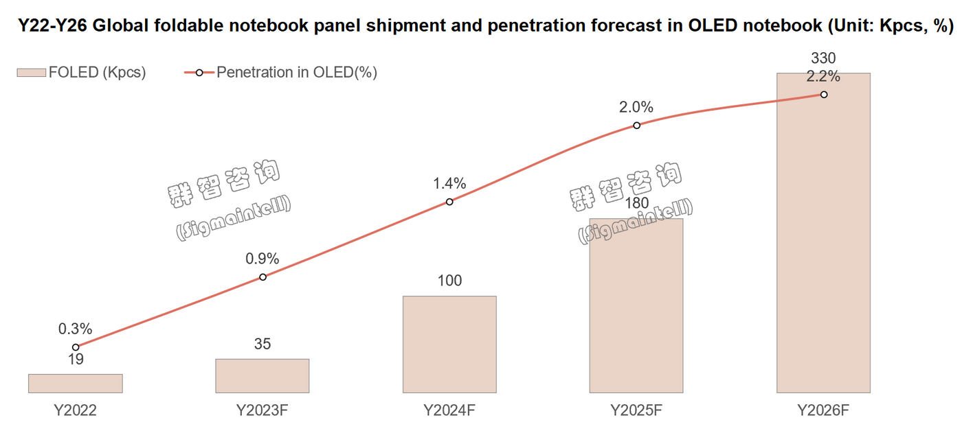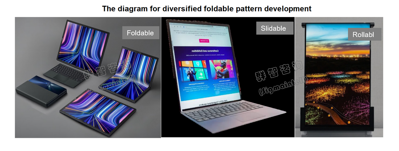 相较于刚性OLED来讲,柔性OLED采用柔性可弯曲基底材料,搭配特殊的薄膜贴合封装,产品具备更好的柔韧性与轻薄性,完全符合笔电产品未来轻薄化、便携化的发展趋势。当前,受限于高昂的成本因素,柔性OLED折叠笔电规模相对有限。然各主力品牌仍在积极布局柔性折叠笔电产品,足以凸显柔性折叠笔电技术的重要性,其仍是未来笔电产品的重要发展方向。根据群智咨询(Sigmaintell)调研信息显示,除上述三大品牌外,戴尔正在积极导入17英寸折叠笔电,三星电子、苹果等品牌也有折叠笔电规划;从供应端来看,BOE(京东方)、LGD(LG显示)、Sharp(夏普)、SDC(三星显示)已量产折叠OLED笔电, CSOT(TCL华星)也在积极进行客户推广;除此之外,柔性直板笔电产品也有望明年实现量产。
