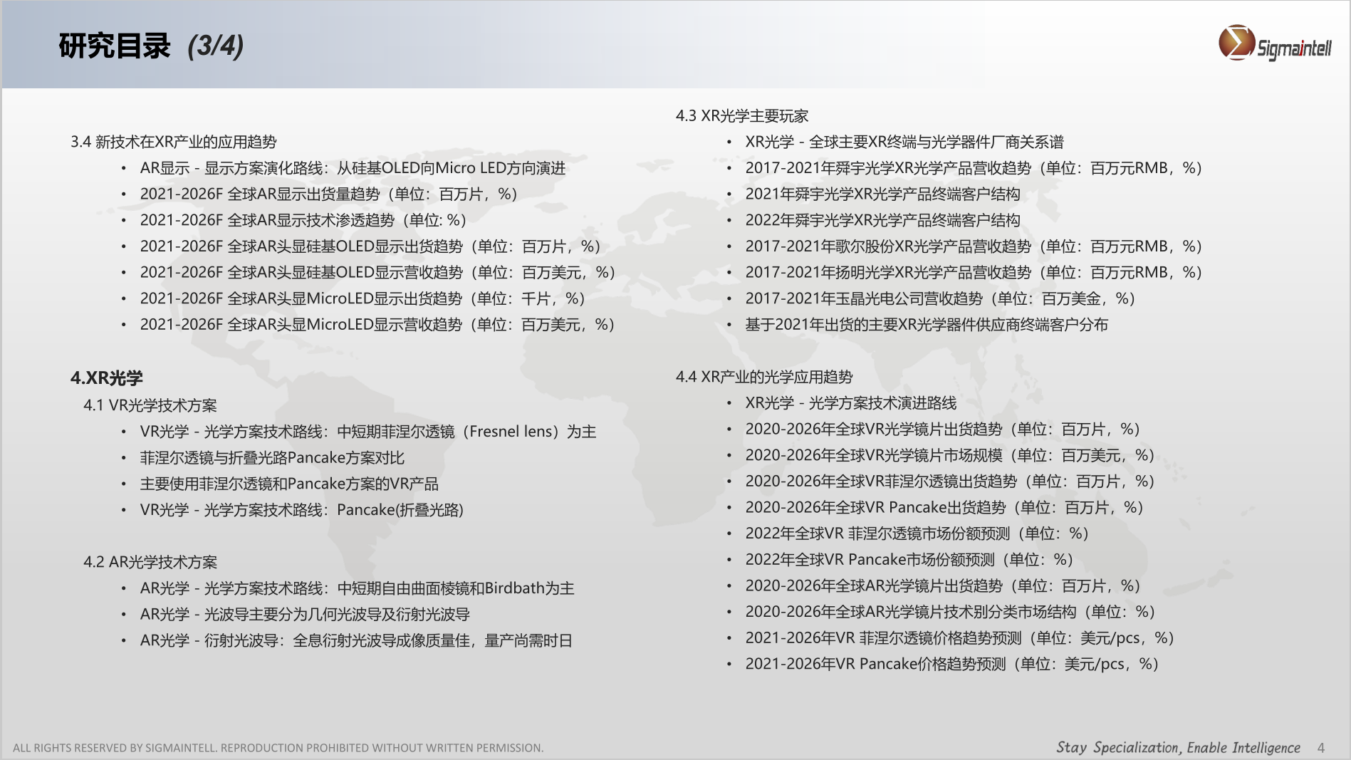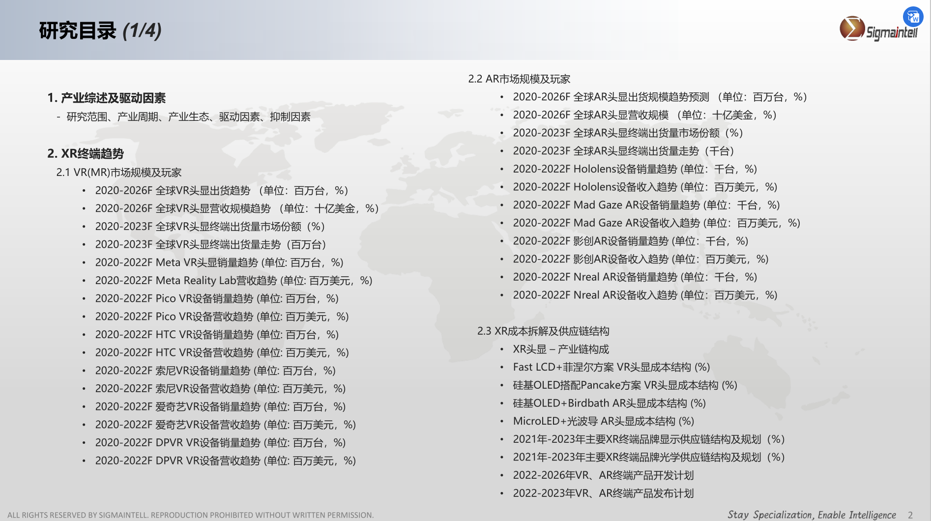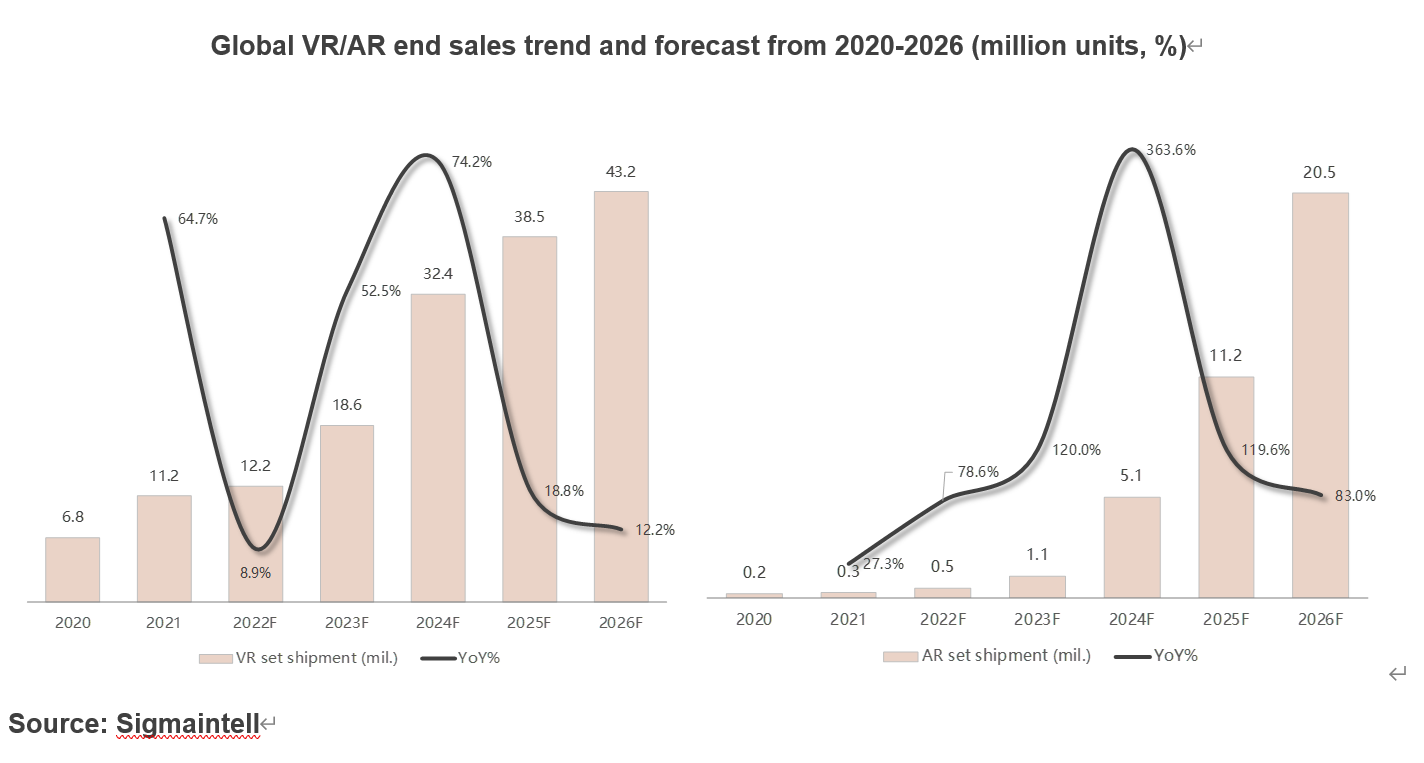 According to Sigmaintell’ s data, global VR end equipment shipments exceeded 10 million in 2021, with sales reaching 11.2 million, an increase of about 65% YOY. With the turbulent external environment, the end demand of the overall consumer electronics market has been weakened and the demand’s growth also has slowed. However, with the launch of Apple's MR products in early 2023, the overall market revenue and average price will be driven significantly higher. The global VR (MR) industry is expected to be about 43 million units in 2026, with 2021~2026 CAGR reaching about 26.4%.