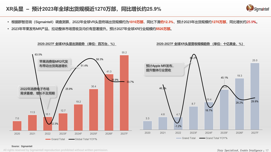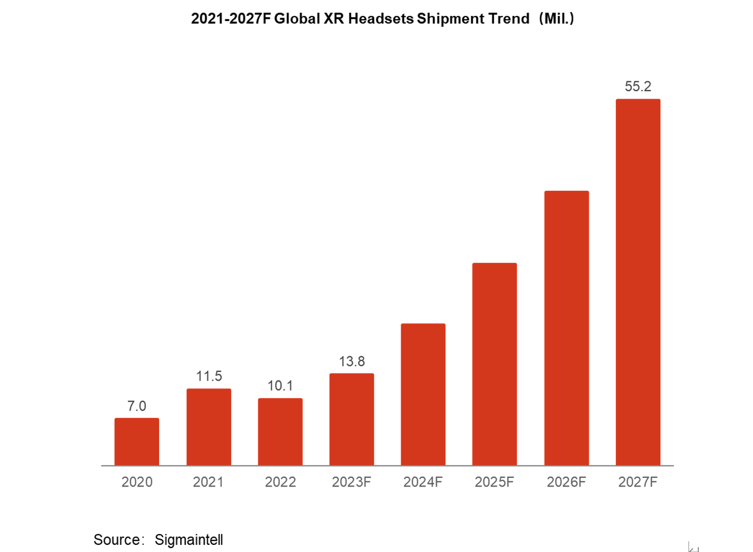 2023年,索尼PS VR2、苹果MR、Meta Quest 3一系列头部品牌新品相继发布,有望促进VR市场出货增长;AR市场中,消费级AR市场的迅速成长有望继续为XR销量增加做出贡献。多新品发布,有望推动2023年行业呈现积极增长态势。群智咨询(Sigmaintell)预计2023年全球XR头显整机出货量有望突破1300万,达到约1380万台,同比增长约36.8%。