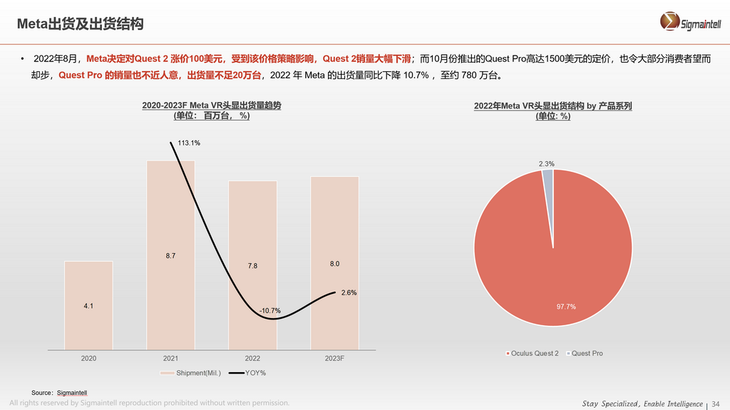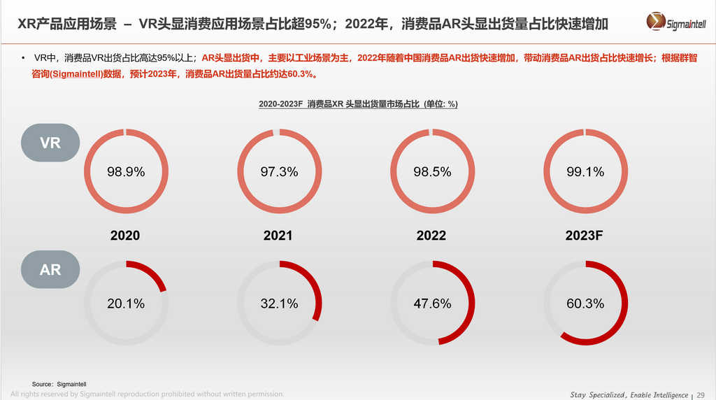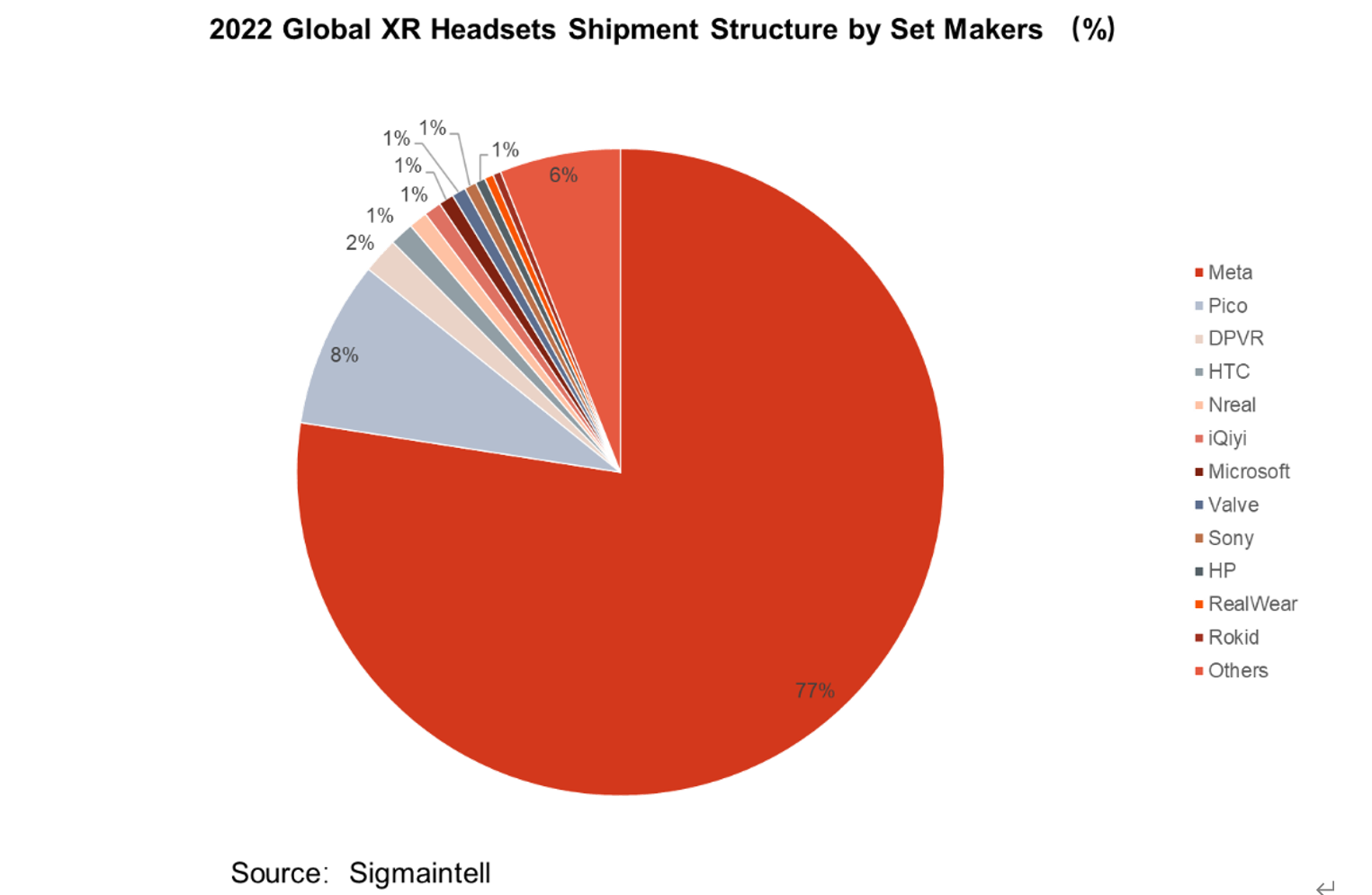 受到整机涨价及经济下行等多因素冲击,2022年全球XR头显市场呈现一定下行趋势。根据群智咨询(Sigmaintell)调查数据,2022年全球XR(VR/ AR)头显整机出货量约1010万,同比下滑约12.3%。具体来看,2022年全球VR头显出货量约为970万台,同比下滑13.1%。究其原因包括全球经济层面的因素,同时Meta在2022年8月的涨价策略,索尼、DPVR等厂商推迟了新品发布等因素也影响了全年销量。AR头显在消费级AR眼镜的拉动下,2022年全球AR头显出货量约为34万台,同比增加约21.4%。